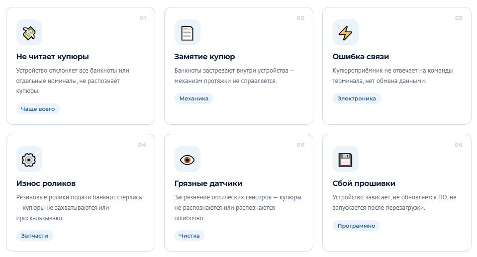 Стоимость ремонта купюроприёмника зависит от модели устройства и характера неисправности. Диагностика проводится бесплатно при последующем ремонте. Для уточнения цены позвоните нам или оставьте заявку — ответим в течение 30 минут.